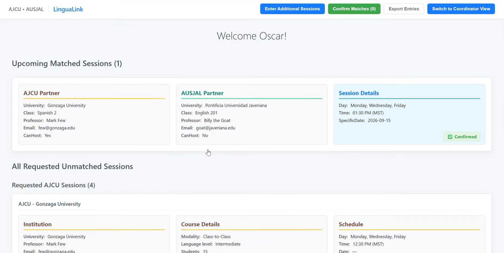 LinguaLink is a full-stack scheduling platform developed in collaboration with Gonzaga University’s Department of Modern Languages to support virtual dual immersion programs across Jesuit universities in the U.S. and Latin America.