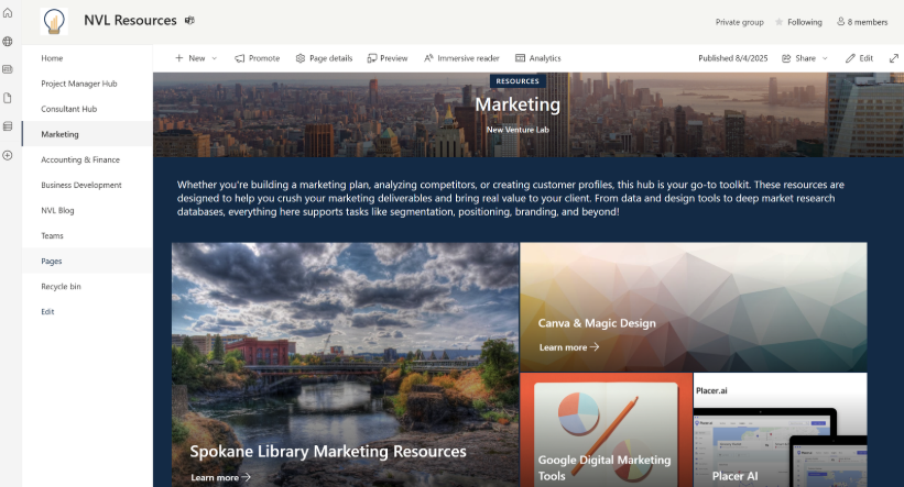 Designed and implemented Gonzaga University’s New Venture Lab’s first permanent knowledge management system to preserve institutional knowledge across leadership transitions. The SharePoint-based Resource Hub centralizes 60+ curated resources, including role-specific training materials, internal templates, and external tool guides.